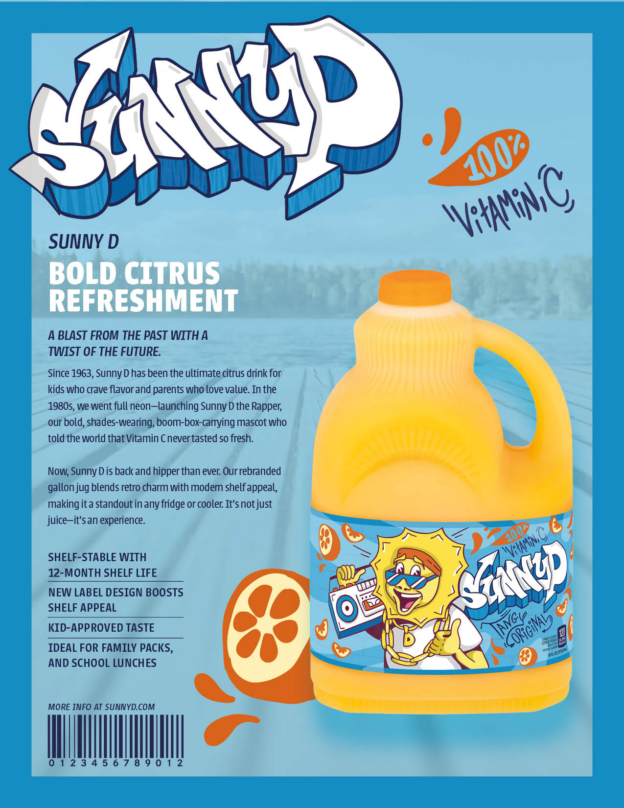 For this rebrand, I leaned into the playful energy of the 1980s, the decade when the brand shortened its name from "Sunny Delight" to "Sunny D" to sound more youthful and hip. I couldn’t help but think "Sunny D" sounded like the name of a rapper, so I ran with it, making Sunny D the Rapper the new face of the bottle.