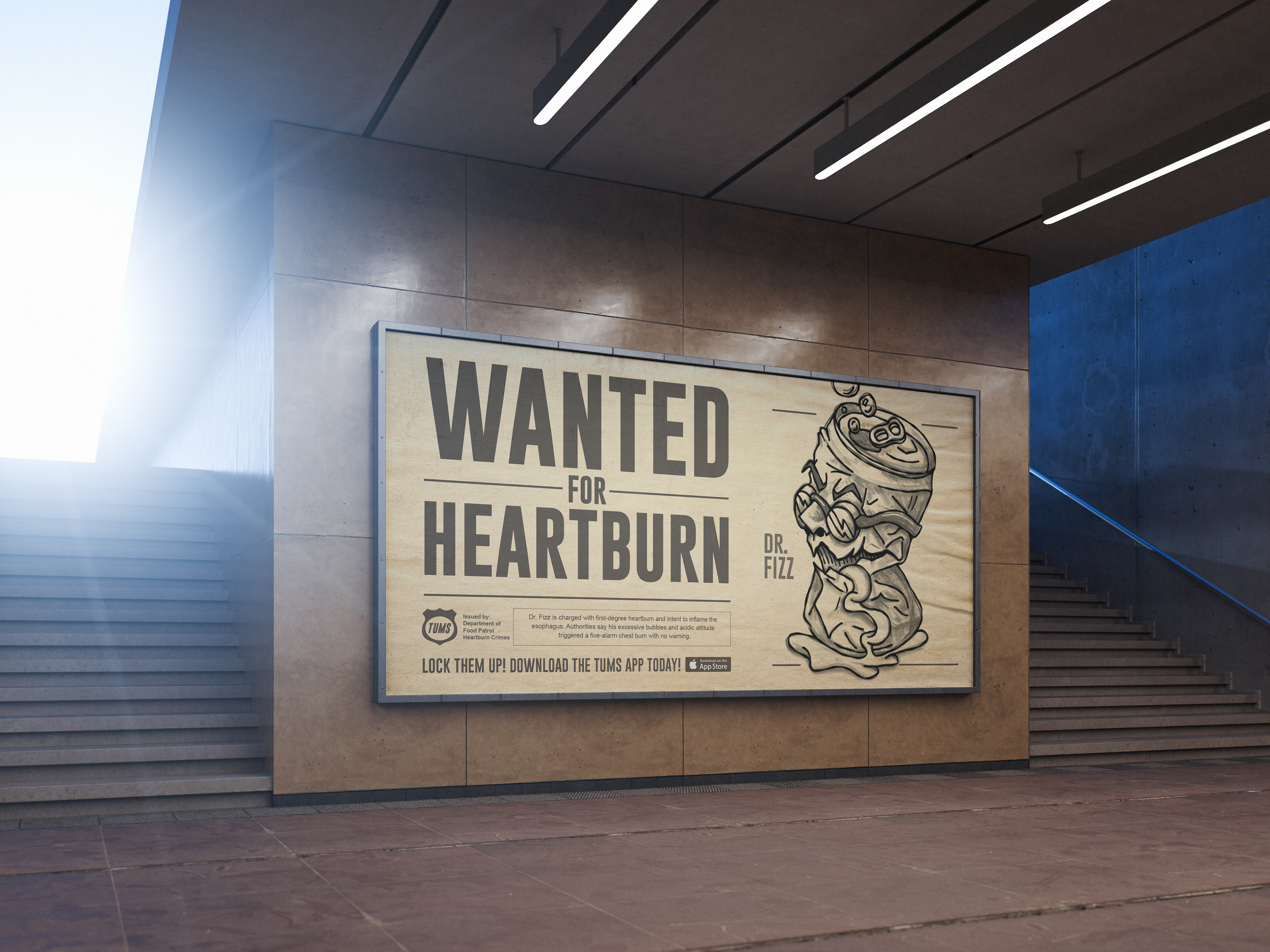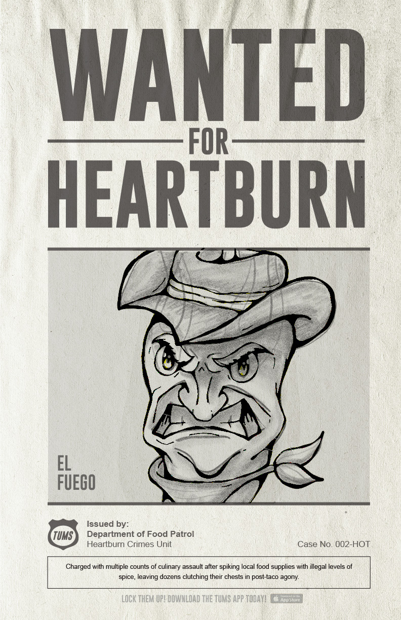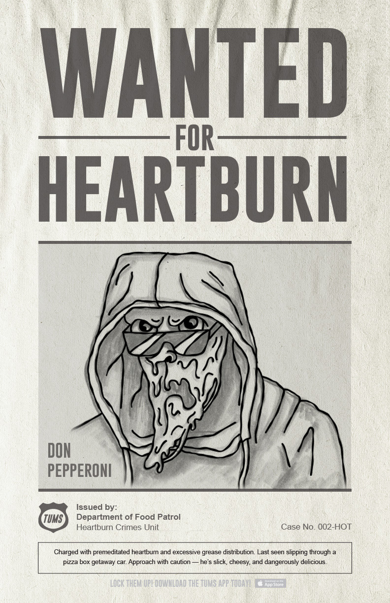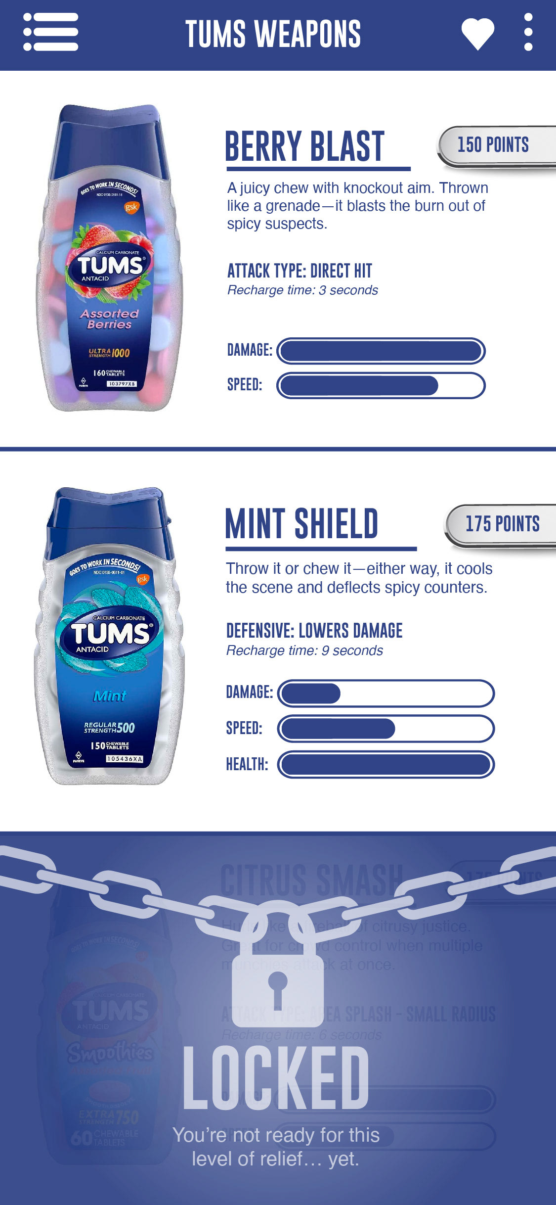"In the TUMS mobile game, players act as food police, tracking down mischievous food-themed criminals causing chaos in the digestive system. With each level, players defeat spicy, greasy, and cheesy culprits with TUMS tablets"
